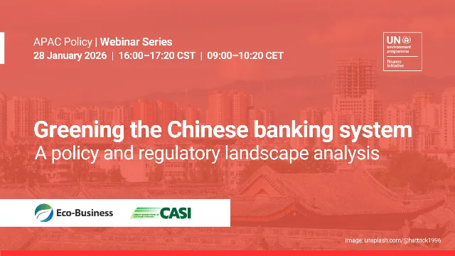 This webinar presents a new UNEP FI policy brief titled “Greening the Chinese Banking System: A Policy and Regulatory Landscape Analysis”. A conducive policy and regulatory enabling environment is widely recognized as essential for mobilizing large-scale green investment. China offers a particularly illustrative case. With policy support, regulatory requirements, and financial incentives, China’s banking sector has emerged as a powerhouse for the country’s green transition, channeling capital into environmental protection, energy transition, sustainable transport, and other sectors. China has mobilized some of the world’s largest volumes of green investment and has developed highly advanced green tech supply chains. Join us for a discussion of: - Factors have enabled these outcomes - How China’s green finance architecture can be understood in light of its broader policy, industrial, and financial ecosystem - Elements of China’s experience that may offer constructive insights for other countries, particularly those seeking to scale green investment while responding to national priorities and development contexts A presentation of findings and conclusions will be followed by a discussion of developments and trends in China and the EU and potential areas of collaboration, featuring leading experts who have been active in greening China’s financial system and have served as technical expert reviewers for the development of the brief. Speakers: - Keynote speaker Ma Jun, Founder and President of the Institute of Finance and Sustainability (IFS) and Chairman of CASI - Lead report author Shouqing Zhu - Junice Yeo, Managing Partner, Eco-Business - Shanning Dong, Director of Green Finance, Bank of Jiangsu - Peiyuan Guo, Chairman of China Sustainable Investment Forum and SynTao Green Finance