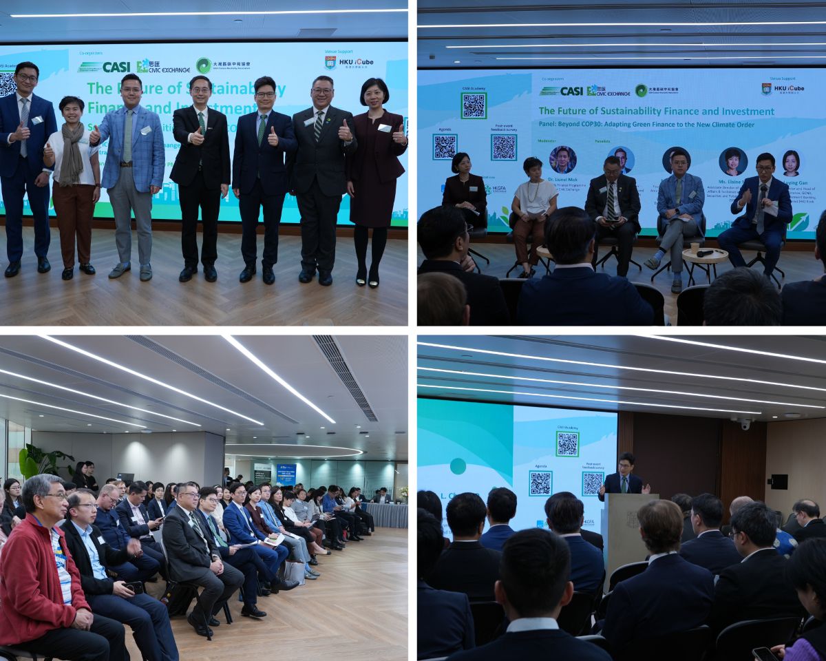 [Hong Kong, January 29, 2026] —“The Future of Sustainability Finance and Investment – Scaling the Transition Beyond COP30” was successfully held on January 27, 2026, at HKU iCube in Central. The event was co-hosted by the Capacity Building Alliance of Sustainability Investment (CASI), Civic Exchange, and the Greater Bay Area Carbon Neutrality Association (GBACNA). As part of Hong Kong’s International Financial Week, the forum brought together leaders from finance, policy, and industry to explore practical and scalable pathways for accelerating green investment across Asia and the Global South. The seminar also received support from the Hong Kong Green Finance Association (HKGFA), the Association of Blockchain Development, Allied Sustainability and Environmental Consultants Group Limited (AEC Group), and HKU iCube for the venue support.